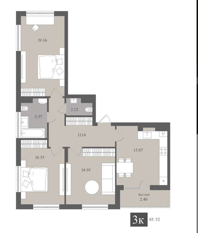 Простор: Несколько спален и большая гостиная (или объединенная кухня-гостиная) создают ощущение свободы и уюта. Комнаты спроектированы так, чтобы обеспечить максимальную функциональность и комфорт для каждого члена семьи.