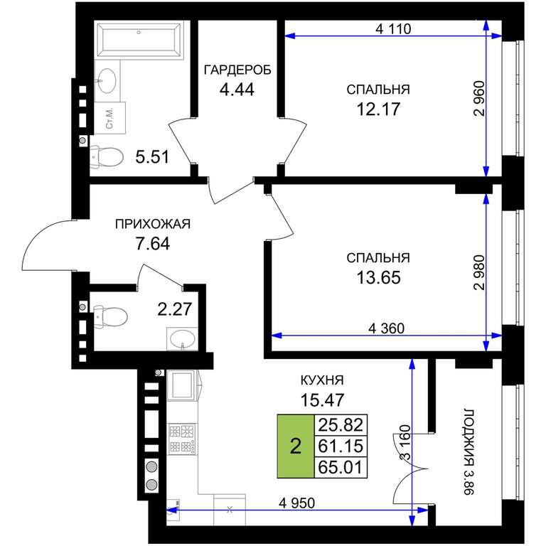Жилая площадь 25.82 м2, кухня 15.47 м2, предчистовая отделка.