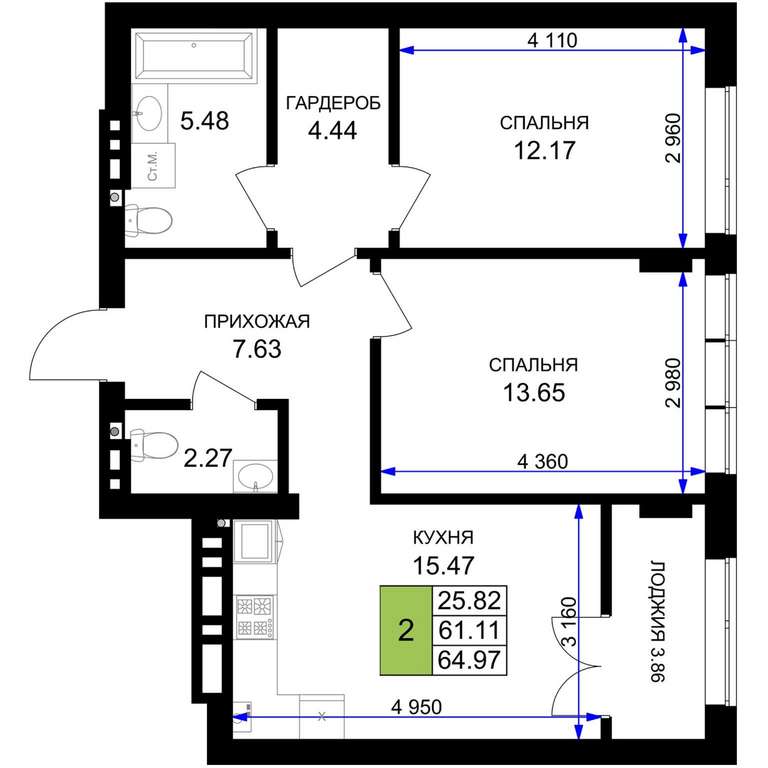 Жилая площадь 25.82 м2, кухня 15.47 м2, предчистовая отделка.