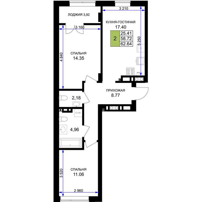 Жилая площадь 25.41 м2, кухня 17.4 м2, предчистовая отделка.