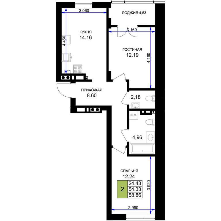 Жилая площадь 24.43 м2, кухня 14.16 м2, предчистовая отделка.