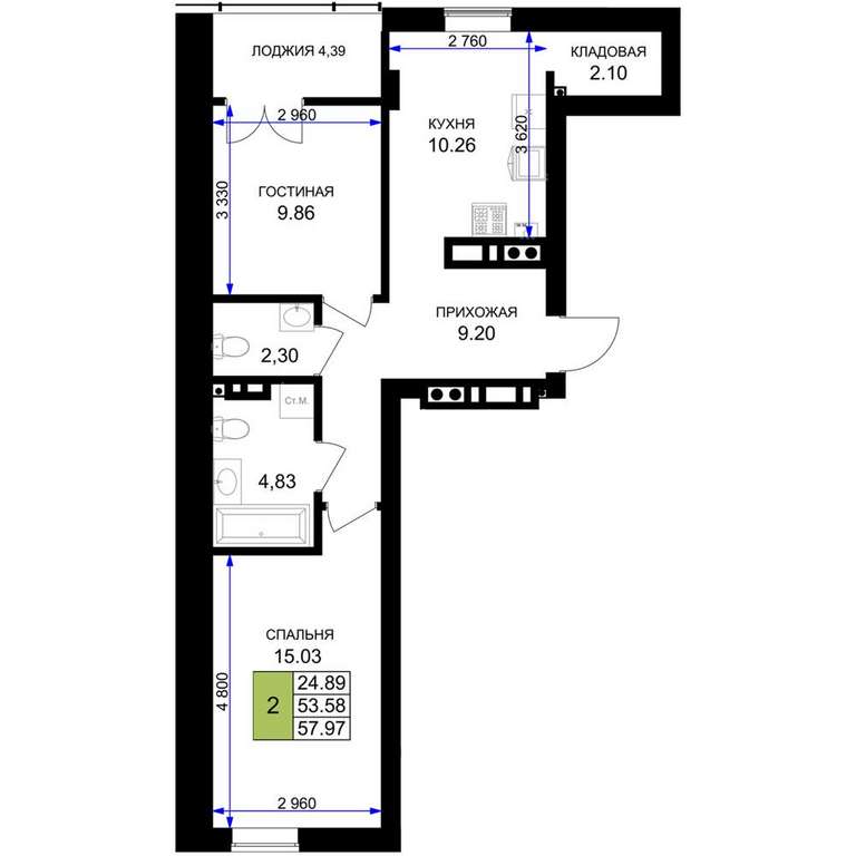 Жилая площадь 24.89 м2, кухня 10.26 м2, предчистовая отделка.