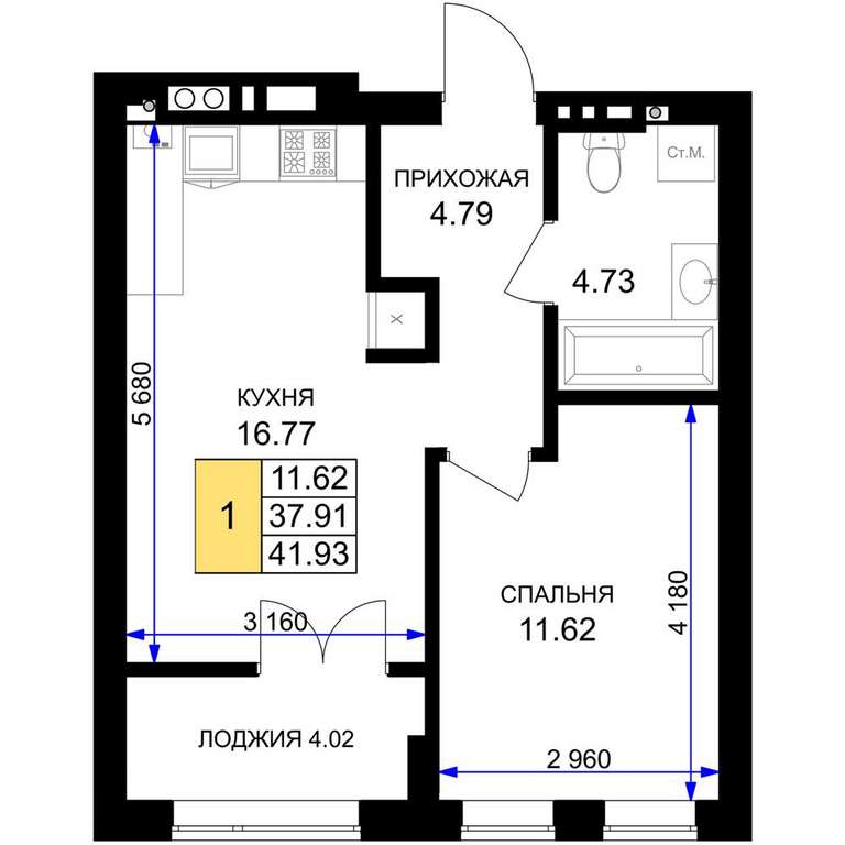 Жилая площадь 11.62 м2, кухня 16.77 м2, предчистовая отделка, комнаты изолированные.