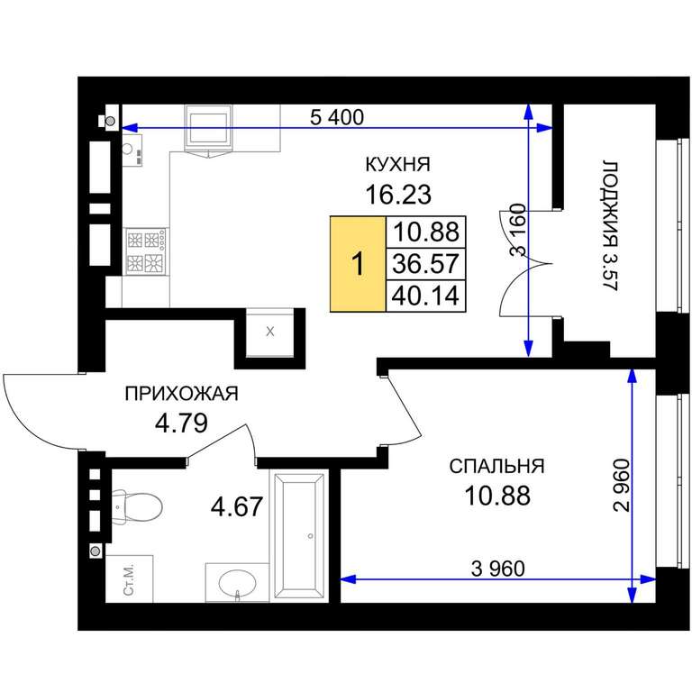 Жилая площадь 10.88 м2, кухня 16.23 м2, предчистовая отделка, комнаты изолированные.