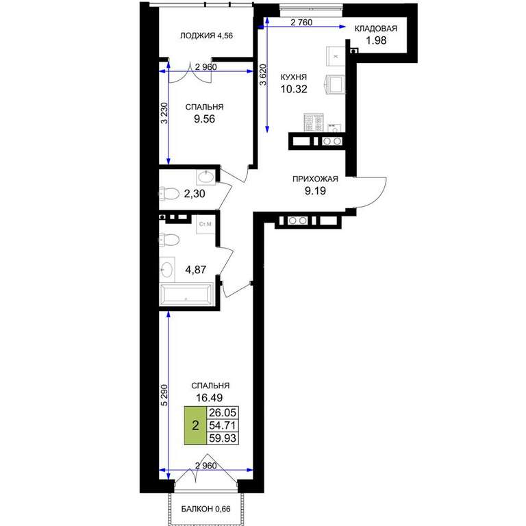 Жилая площадь 26.05 м2, кухня 10.32 м2, предчистовая отделка.