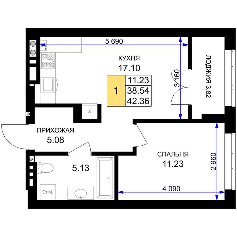 Жилая площадь 11.23 м2, кухня 17.1 м2, предчистовая отделка, комнаты изолированные.