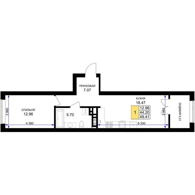 Жилая площадь 12.96 м2, кухня 18.47 м2, предчистовая отделка, комнаты изолированные.