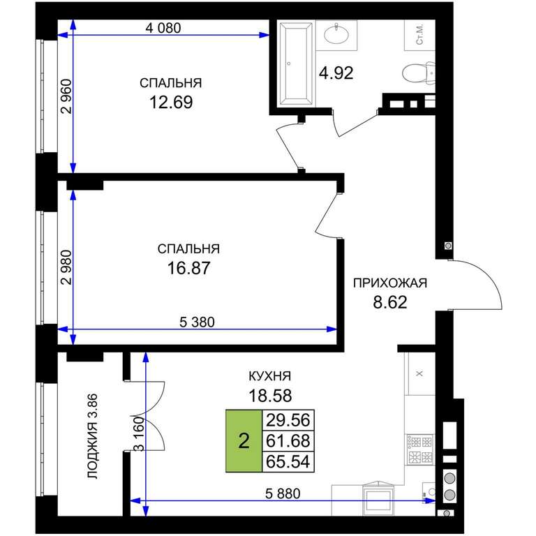 Жилая площадь 29.56 м2, кухня 18.58 м2, предчистовая отделка.