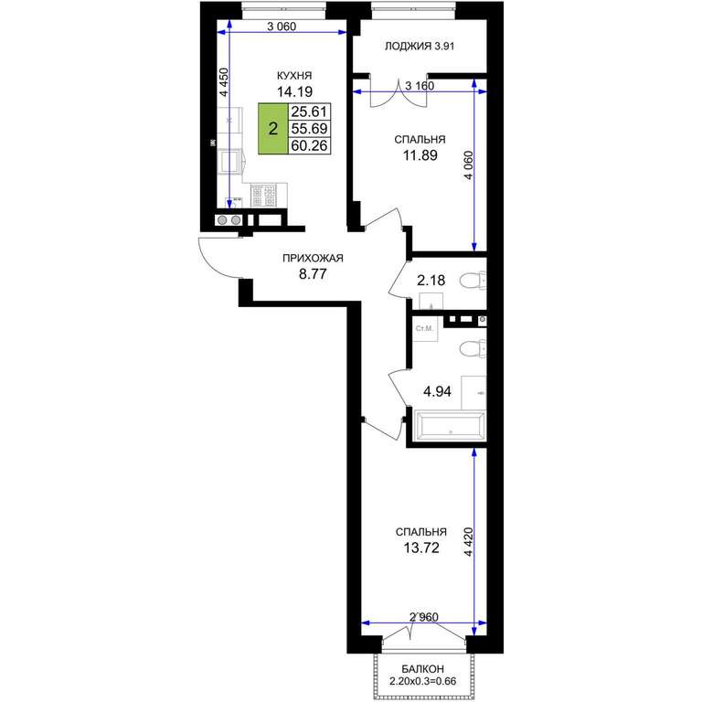 Жилая площадь 25.61 м2, кухня 14.19 м2, предчистовая отделка.
