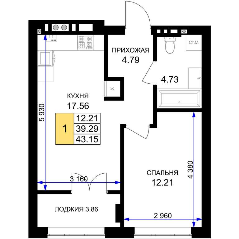 Жилая площадь 12.21 м2, кухня 17.56 м2, предчистовая отделка, комнаты изолированные.