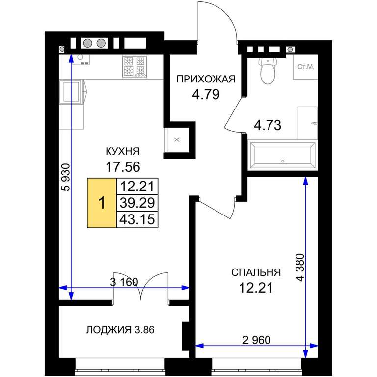Жилая площадь 12.21 м2, кухня 17.56 м2, предчистовая отделка, комнаты изолированные.