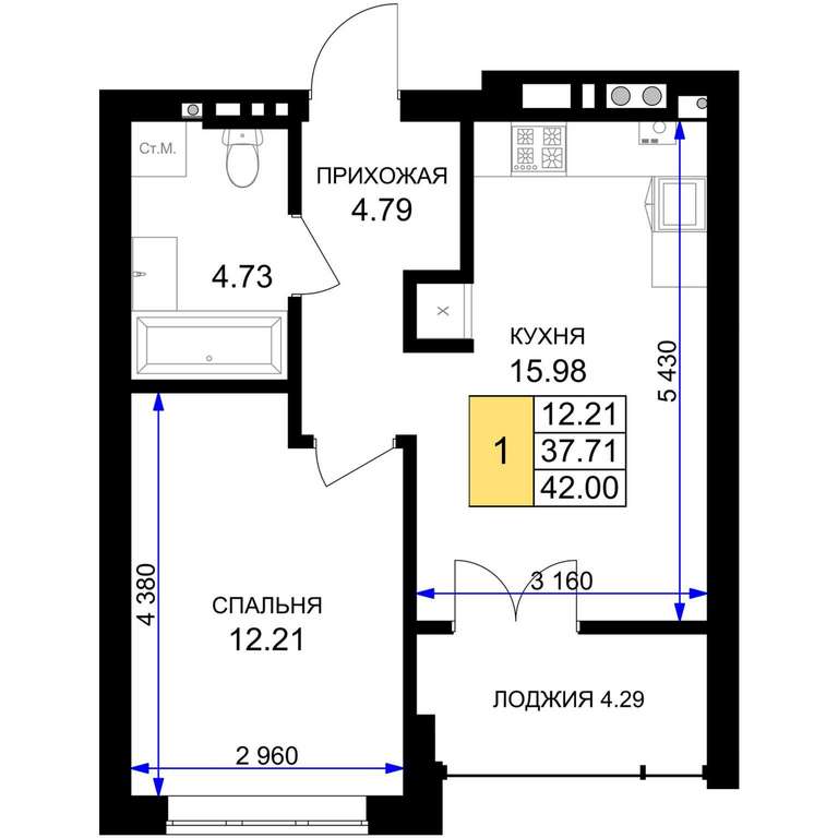 Жилая площадь 12.21 м2, кухня 15.98 м2, предчистовая отделка, комнаты изолированные.