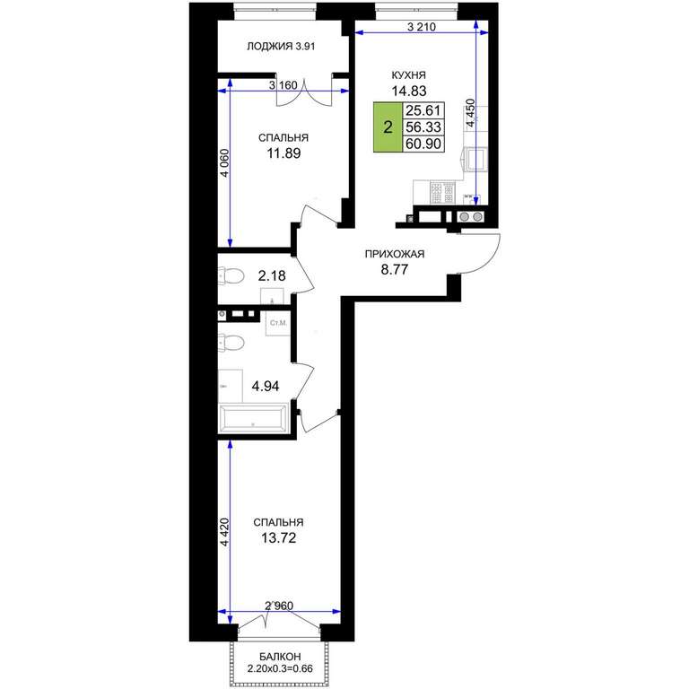 Жилая площадь 25.61 м2, кухня 14.83 м2, предчистовая отделка.