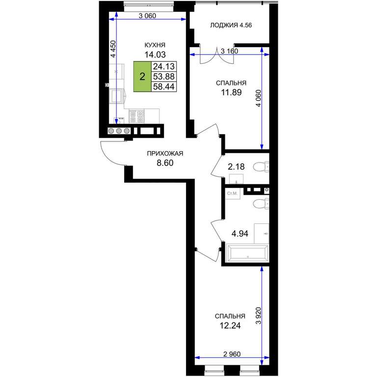Жилая площадь 24.13 м2, кухня 14.03 м2, предчистовая отделка.
