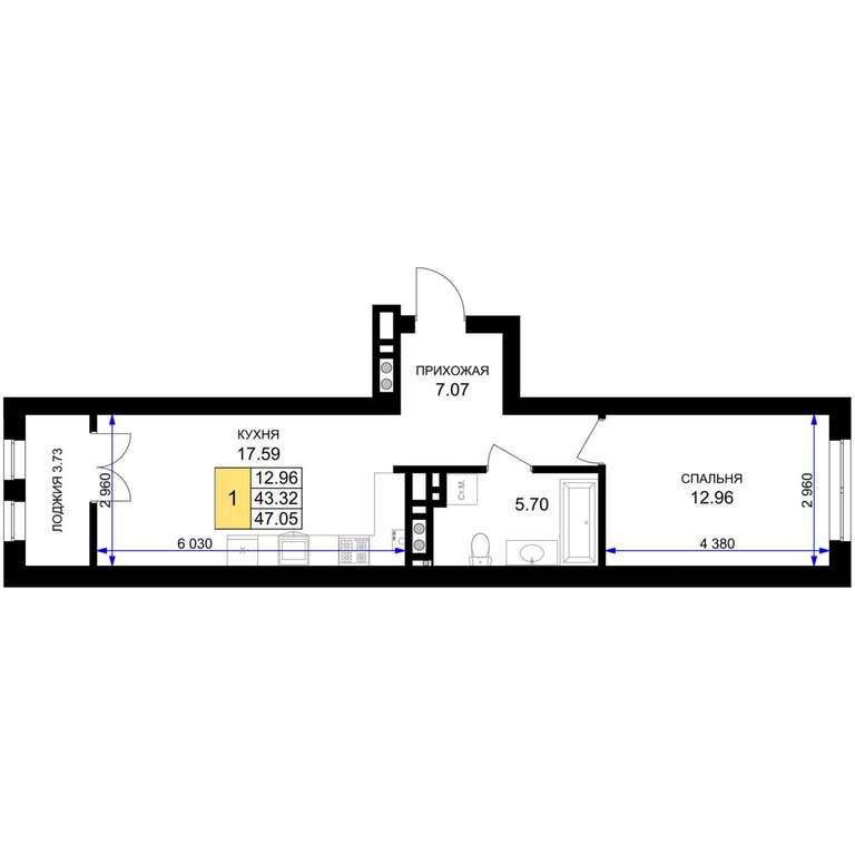 Жилая площадь 12.96 м2, кухня 17.59 м2, предчистовая отделка, комнаты изолированные.
