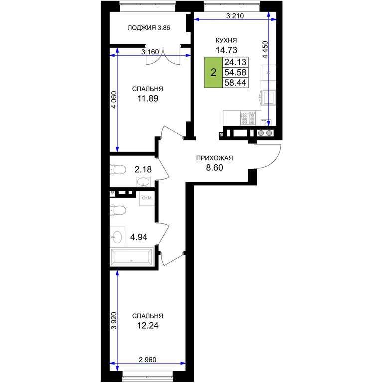 Жилая площадь 24.13 м2, кухня 14.73 м2, предчистовая отделка.