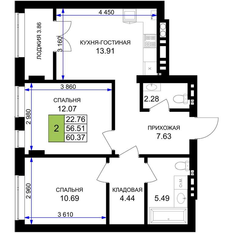 Жилая площадь 22.76 м2, кухня 13.91 м2, предчистовая отделка.