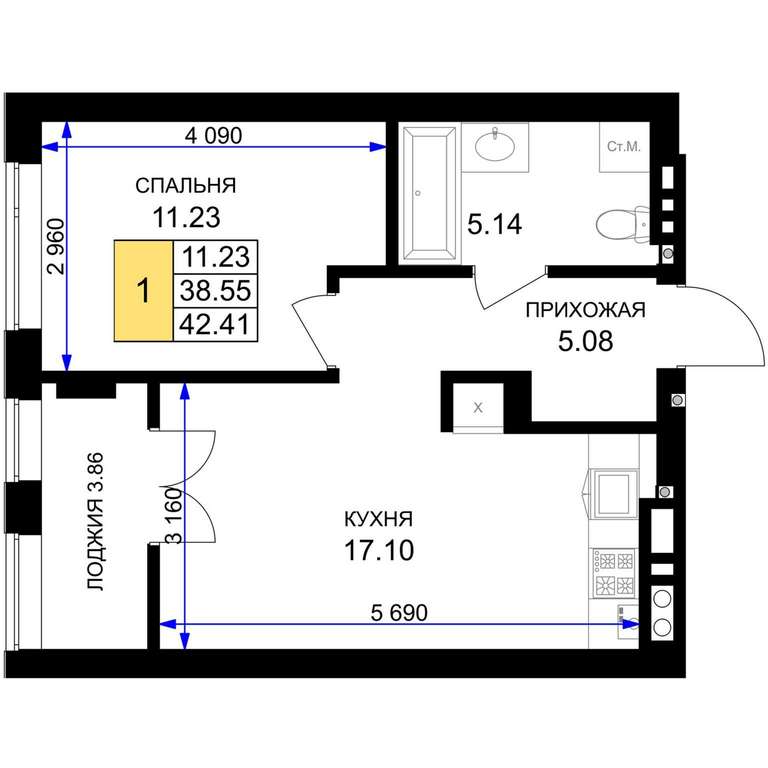 Жилая площадь 11.23 м2, кухня 17.1 м2, предчистовая отделка, комнаты изолированные.
