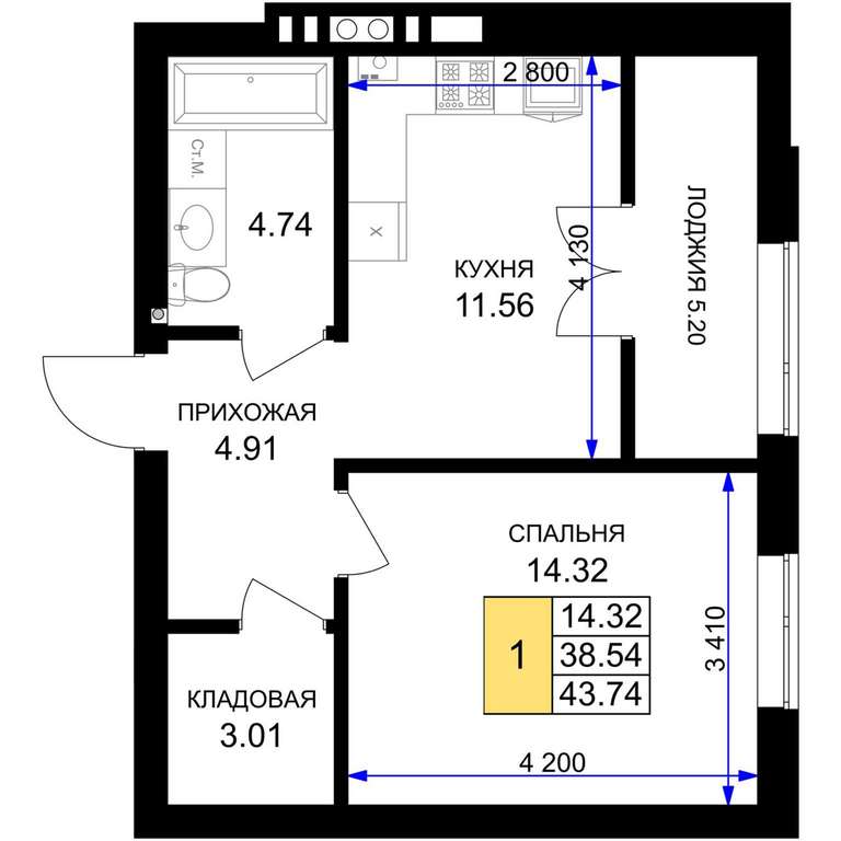 Жилая площадь 14.32 м2, кухня 11.56 м2, предчистовая отделка, комнаты изолированные.