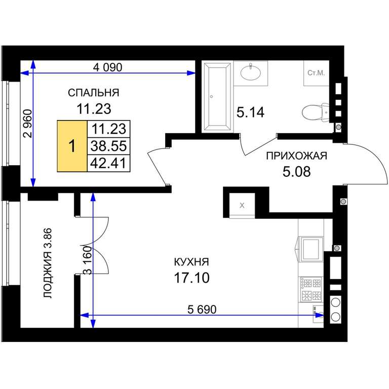 Жилая площадь 11.23 м2, кухня 17.1 м2, предчистовая отделка, комнаты изолированные.