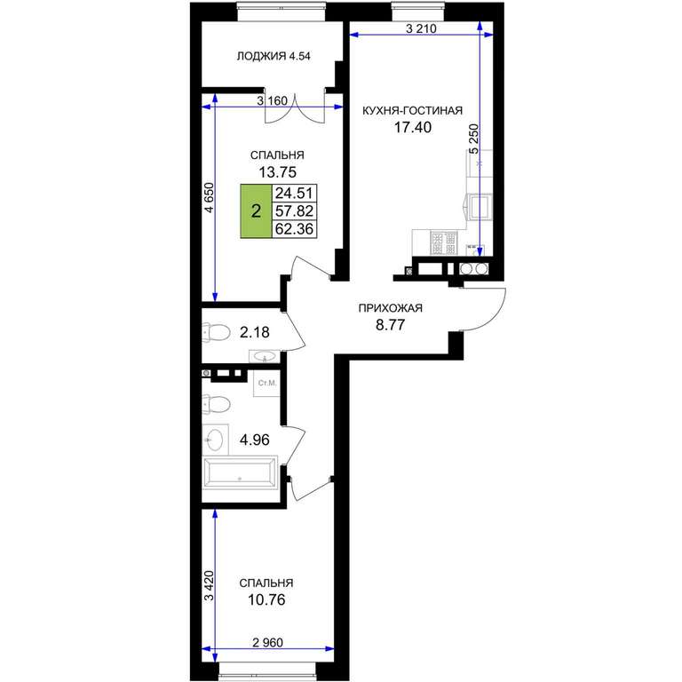 Жилая площадь 24.51 м2, кухня 17.4 м2, предчистовая отделка.