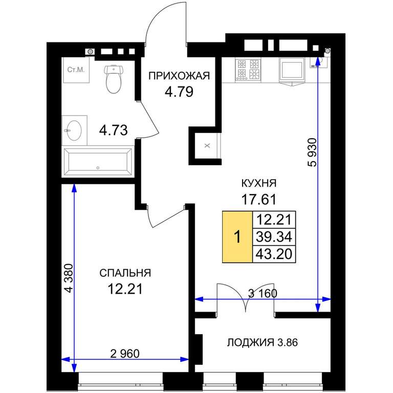 Жилая площадь 12.21 м2, кухня 17.61 м2, предчистовая отделка, комнаты изолированные.