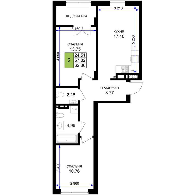 Жилая площадь 24.51 м2, кухня 17.4 м2, предчистовая отделка.