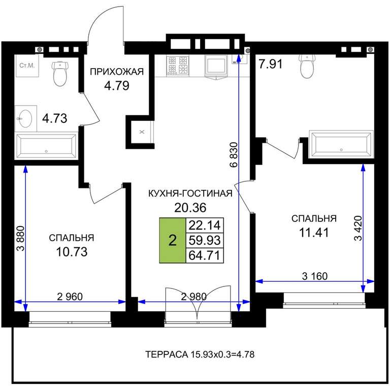 Жилая площадь 22.14 м2, кухня 20.36 м2, предчистовая отделка.