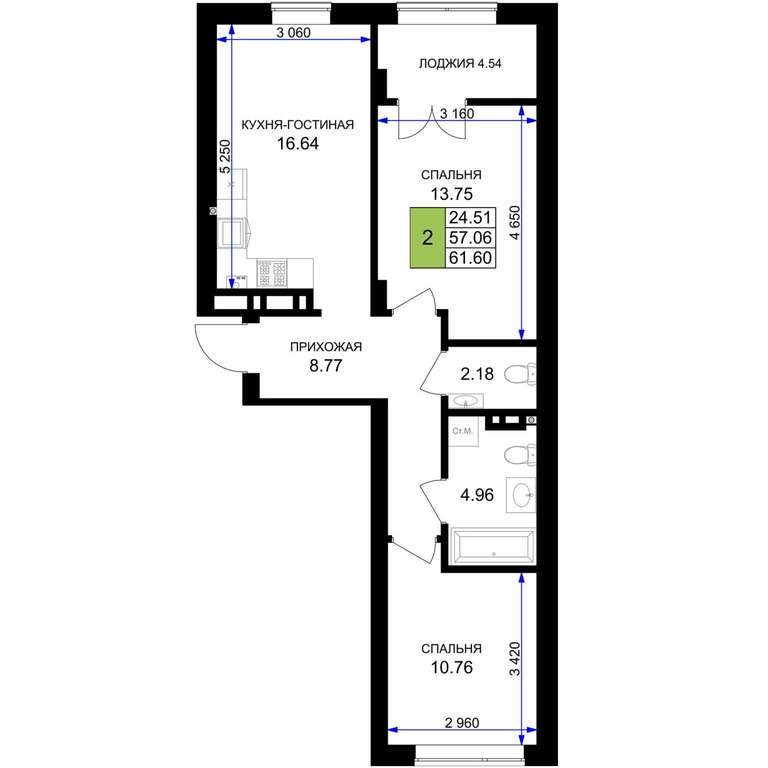 Жилая площадь 24.51 м2, кухня 16.64 м2, предчистовая отделка.