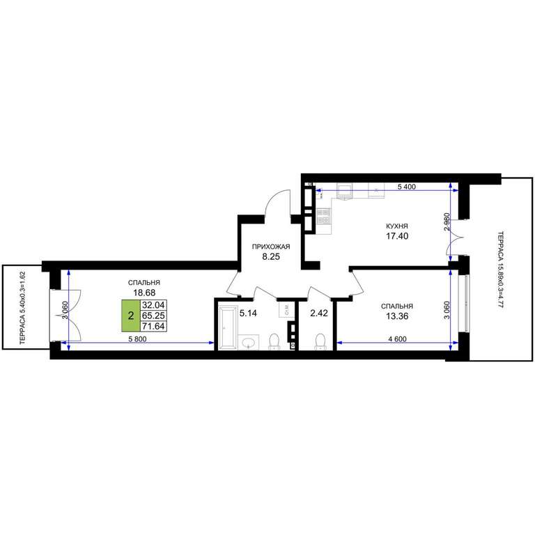 Жилая площадь 32.04 м2, кухня 17.4 м2, предчистовая отделка.