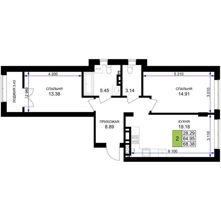 - 68.38 м2