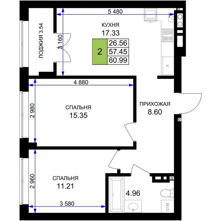Жилая площадь 26.56 м2, кухня 17.33 м2, предчистовая отделка.