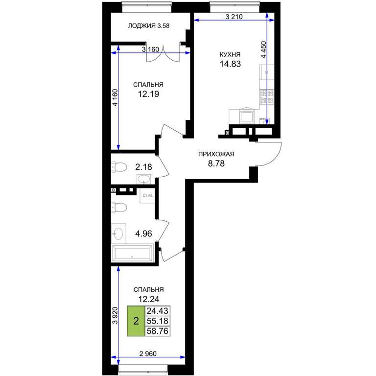 Жилая площадь 24.43 м2, кухня 14.83 м2, предчистовая отделка.