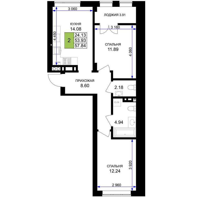 Жилая площадь 24.13 м2, кухня 14.08 м2, предчистовая отделка.