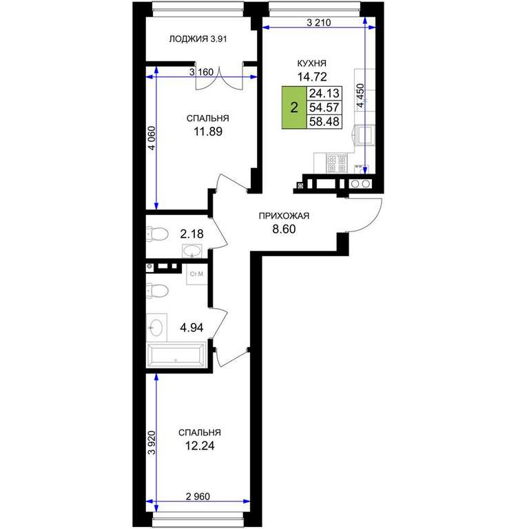 Жилая площадь 24.13 м2, кухня 14.72 м2, предчистовая отделка.