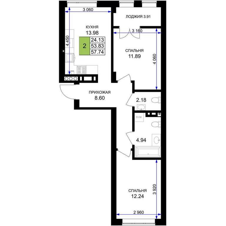 Жилая площадь 24.13 м2, кухня 13.98 м2, предчистовая отделка.