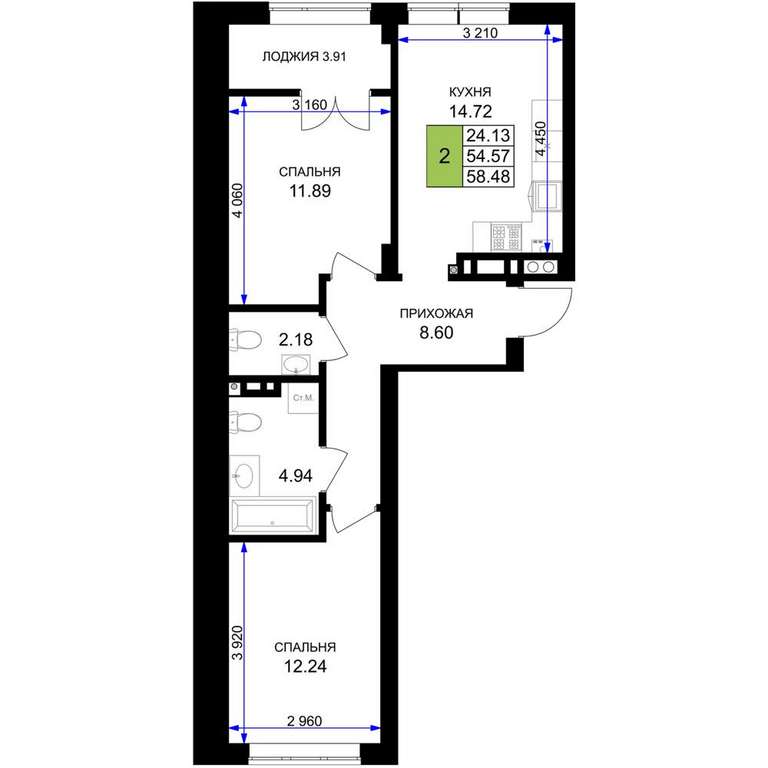 Жилая площадь 24.13 м2, кухня 14.72 м2, предчистовая отделка.