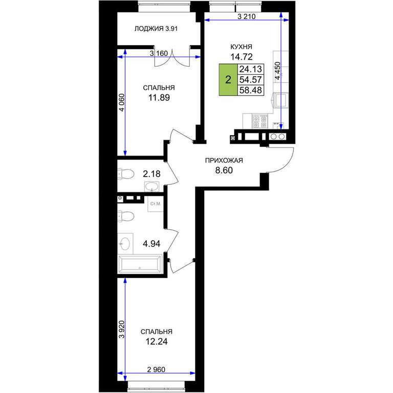 Жилая площадь 24.13 м2, кухня 14.72 м2, предчистовая отделка.