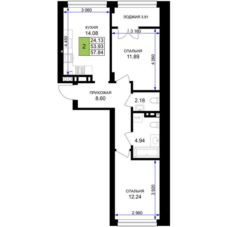 Жилая площадь 24.13 м2, кухня 14.08 м2, предчистовая отделка.
