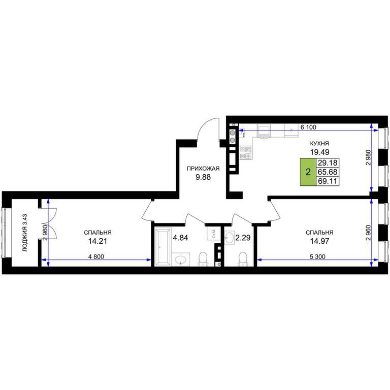 - 69.11 м2