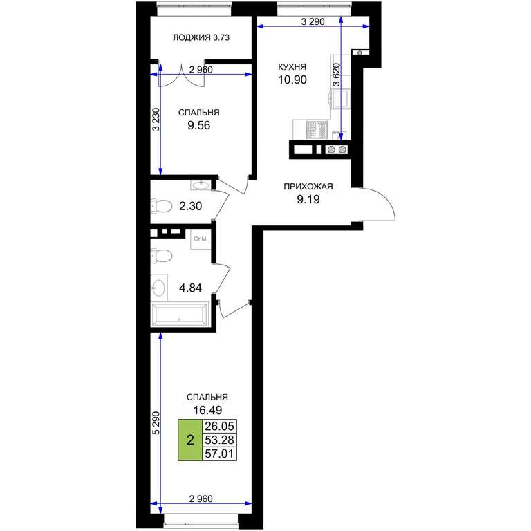 Жилая площадь 26.05 м2, кухня 10.9 м2, предчистовая отделка.