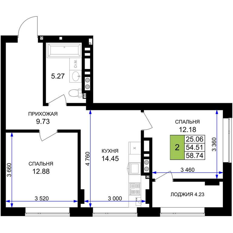 Жилая площадь 25.06 м2, кухня 14.45 м2, предчистовая отделка.