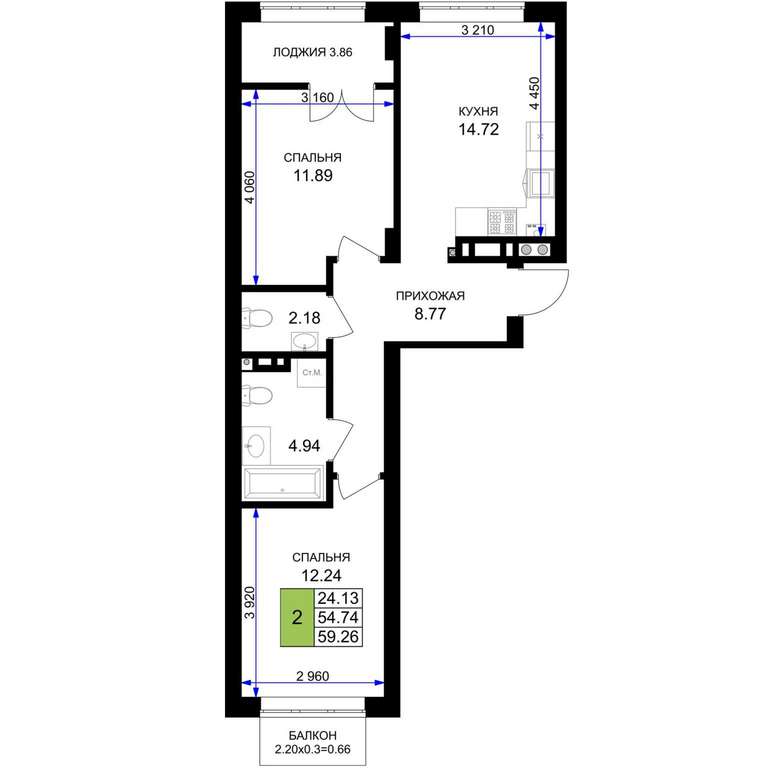 Жилая площадь 24.13 м2, кухня 14.72 м2, предчистовая отделка.