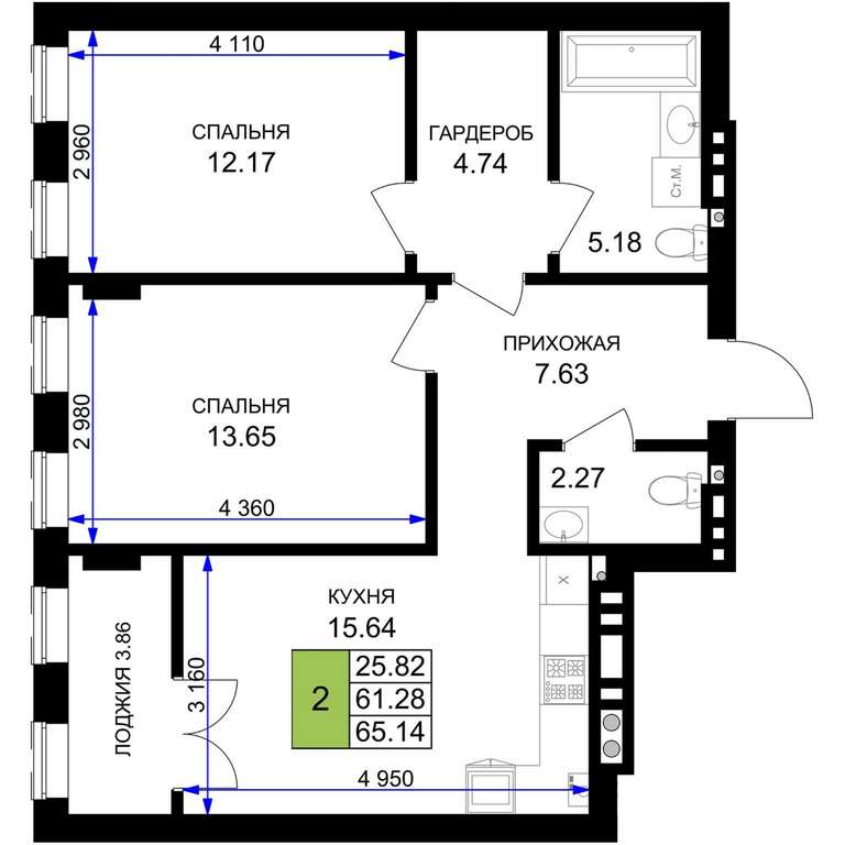Жилая площадь 25.82 м2, кухня 15.64 м2, предчистовая отделка.