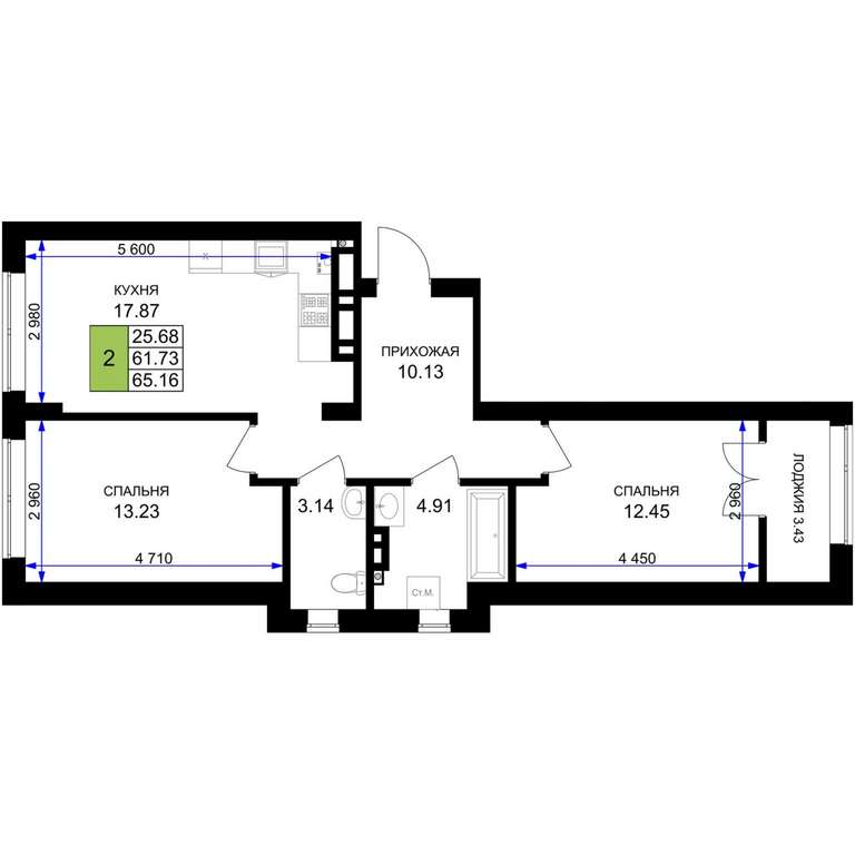 Жилая площадь 25.68 м2, кухня 17.87 м2, предчистовая отделка.