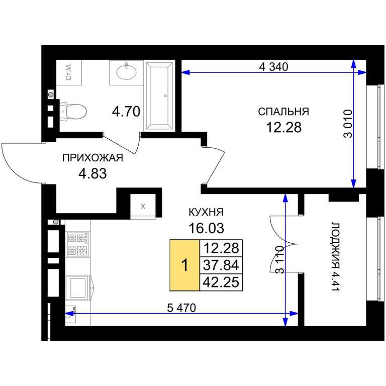 Жилая площадь 12.28 м2, кухня 16.03 м2, предчистовая отделка, комнаты изолированные.