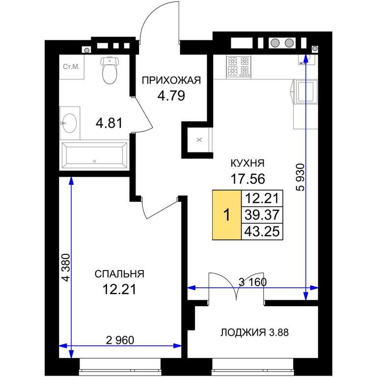 Жилая площадь 12.21 м2, кухня 17.56 м2, предчистовая отделка, комнаты изолированные.