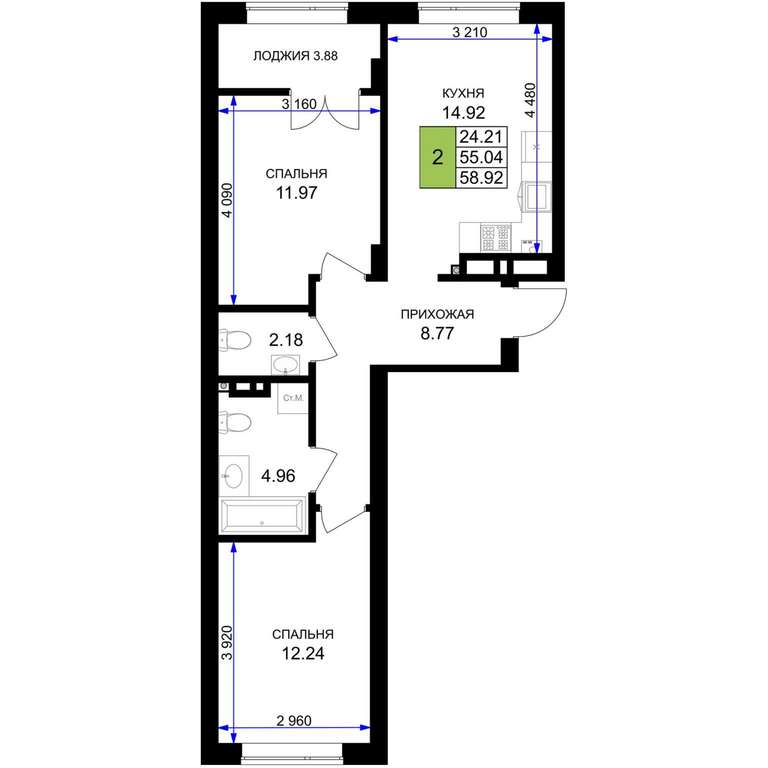 Жилая площадь 24.21 м2, кухня 14.92 м2, предчистовая отделка.