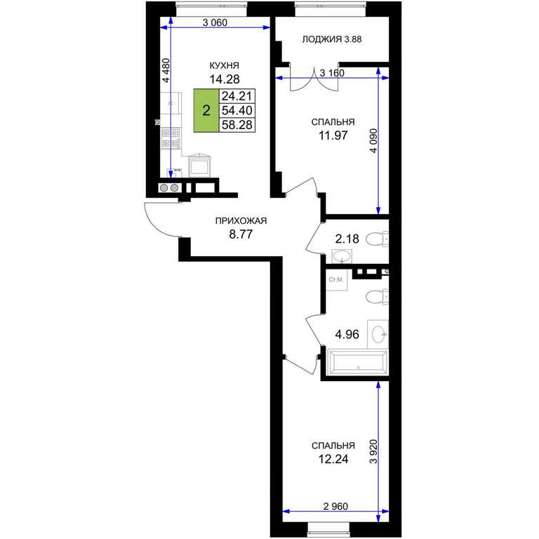 Жилая площадь 24.21 м2, кухня 14.28 м2, предчистовая отделка.