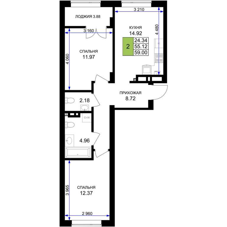 Жилая площадь 24.34 м2, кухня 14.92 м2, предчистовая отделка.
